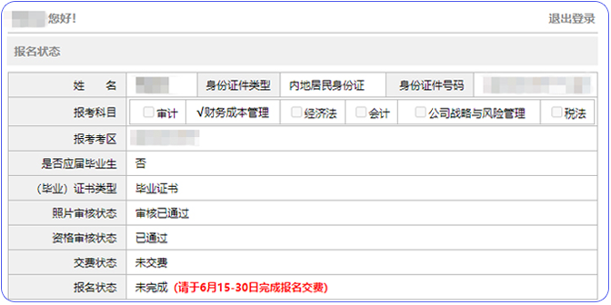 注意:以上例圖【報名狀態(tài)】欄顯示“未交費”,說明考生暫未完成報名交費。
