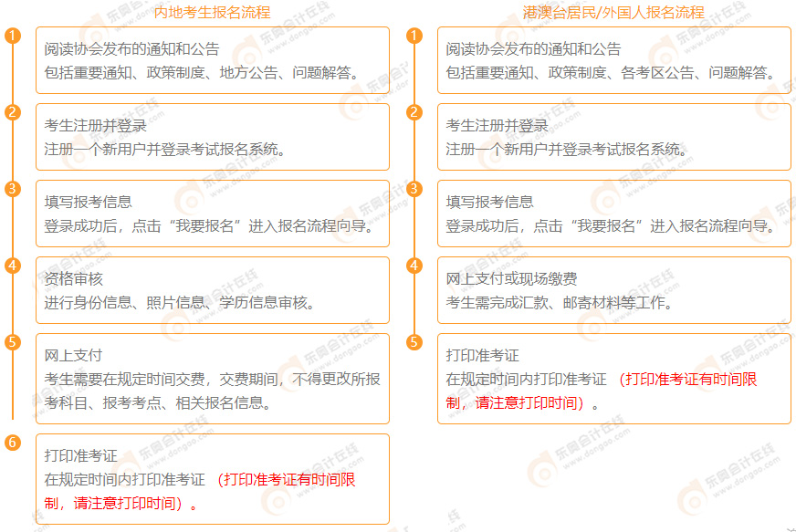 了解注冊(cè)會(huì)計(jì)師考試報(bào)名流程是非常有必要的,以下是東奧小編整理的注會(huì)報(bào)名流程,分別適用于內(nèi)地考生和港澳臺(tái)/外國(guó)考生,快來(lái)看看吧!
