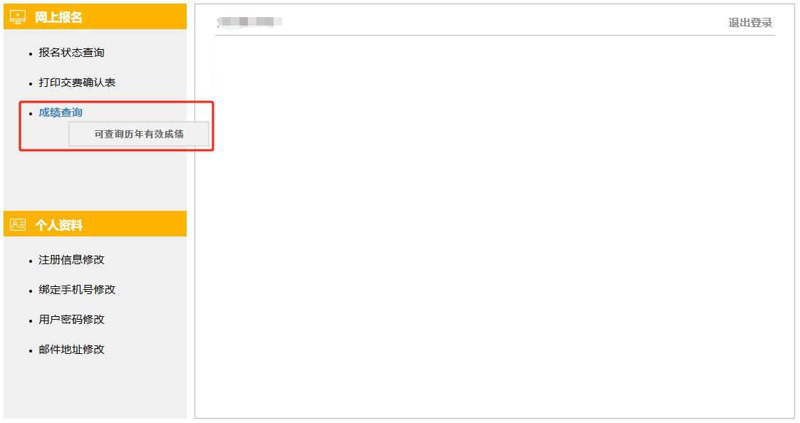 第2步:登錄成功后,點擊左側“成績查詢”按鈕,網報系統提示,考生也可在此查詢歷年有效成績。