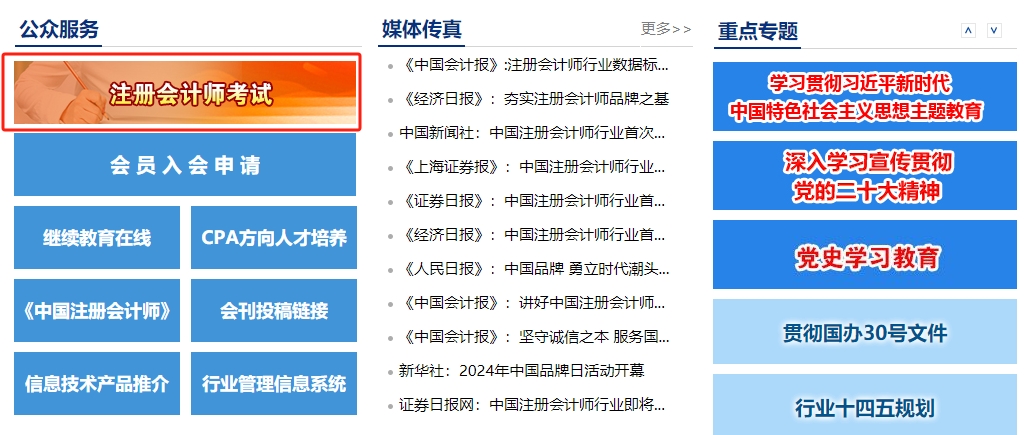 步驟1:進入“中國注冊會計師協(xié)會”官方網(wǎng)站,點擊“注冊會計師考試”按鈕。