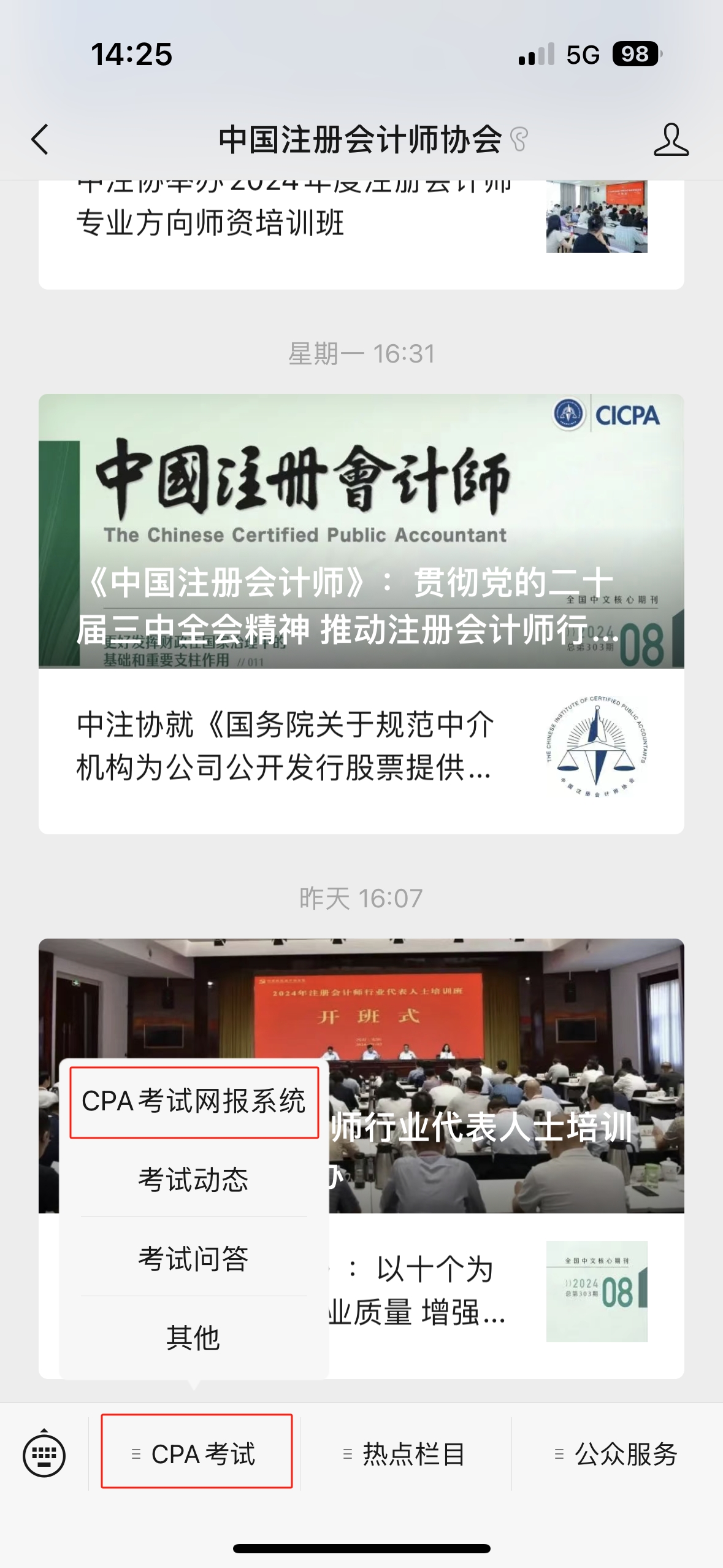 步驟1:微信搜索“中國注冊會計師協(xié)會”官方公眾號,點擊底部菜單欄中“CPA考試”按鈕,選擇“CPA考試網(wǎng)報系統(tǒng)”選項。