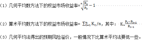 (1)算術(shù)平均數(shù)的理由:更符合資本資產(chǎn)定價模型中的平均方差結(jié)構(gòu) (2)幾何平均數(shù)的理由:考慮了復(fù)合平均,能更好地預(yù)測長期的平均風(fēng)險溢價。 多數(shù)人傾向于采用幾何平均法。 |