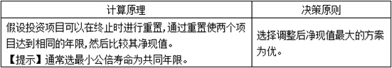 (1)計(jì)算兩項(xiàng)目的凈現(xiàn)值; (2)計(jì)算凈現(xiàn)值的等額年金額=該方案凈現(xiàn)值/(P/A,i,n) (3)永續(xù)凈現(xiàn)值=等額年金額/資本成本i 【提示】等額年金法的最后一步即永續(xù)凈現(xiàn)值的計(jì)算,并非總是必要的。在資本成本相同時(shí),等額年金大的項(xiàng)目永續(xù)凈現(xiàn)值肯定大,根據(jù)等額年金大小就可以直接判斷項(xiàng)目的優(yōu)劣。 |