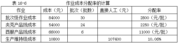作業(yè)成本分配的第一步是計算作業(yè)成本動因的單位成本,作為作業(yè)成本的分配率,如表16-6所示。
