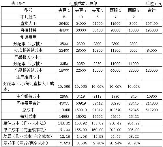 采用傳統(tǒng)的完全成本法時,制造費(fèi)用使用統(tǒng)一的分配率如表16-5所示。