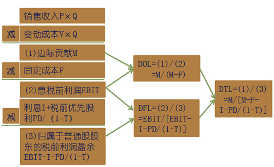 DTL=DOL×DFL=(△EBIT/EBIT)/(△Q/Q)×(△EPS/EPS)/(△EBIT/EBIT)=(△EPS/EPS)/(△Q/Q)