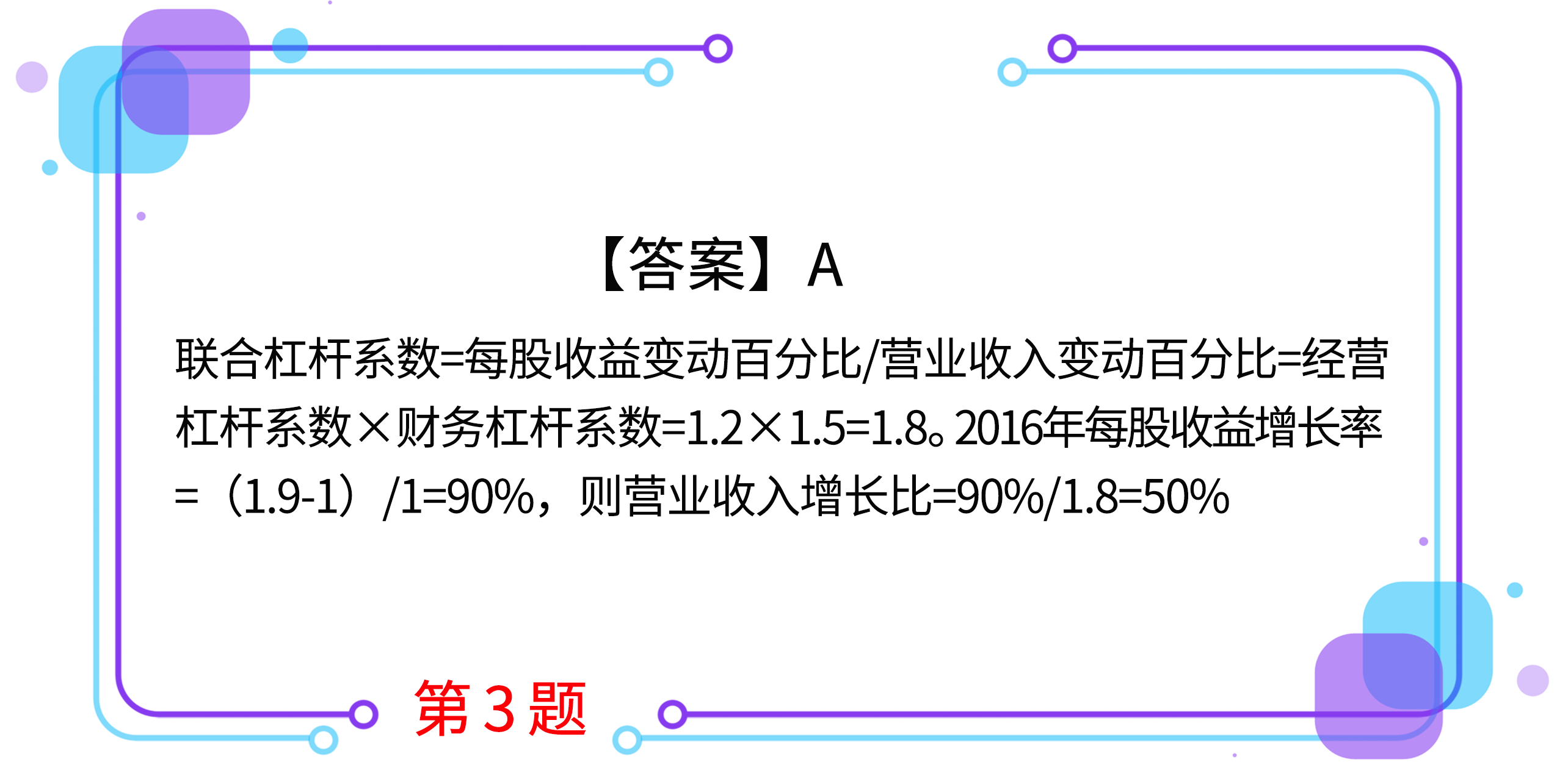 2.甲公司2016年營業(yè)收入1000萬元,變動成本率60%,固定成本200萬元,利息費用40萬元。假設(shè)不存在資本化利息且不考慮其他因素,該企業(yè)聯(lián)合杠桿系數(shù)是( )。(2017年第Ⅰ套)