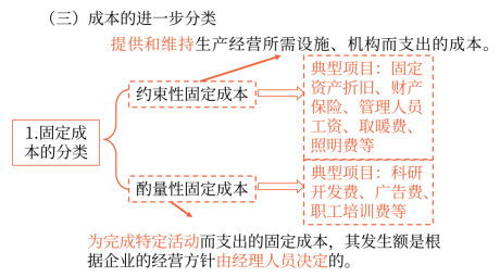 約束性 固定成本 (承擔(dān)固定成本) | (1)以前決策的結(jié)果,現(xiàn)在已經(jīng)很難改變,即不能通過當(dāng)前的管理決策行動加以改變的固定成本。 (2)要想降低約束性固定成本,只能從合理利用經(jīng)營能力,降低單位固定成本入手。 |