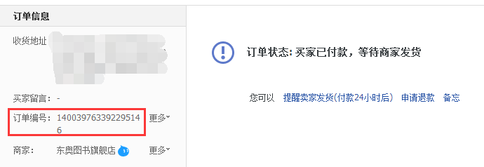 ①在天貓”東奧圖書旗艦店“下單成功后,保留”訂單編號(hào)“界面。