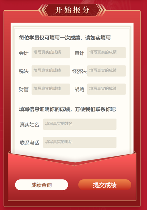 12月21日-1月22日期間,凡參與報分活動的考生,需準(zhǔn)確填寫自己2020年注會考試成績。在這里需要注意的是:考生們每人只能填寫一次,在提交時考生們要注意檢查哦!