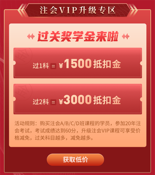 凡購買注會A/B/C/D班課程,參加20年注會考試,且成績達(dá)到60分+的考生,均可享受升級注會VIP班價格減免的活動,過關(guān)科目越多,減免越多。