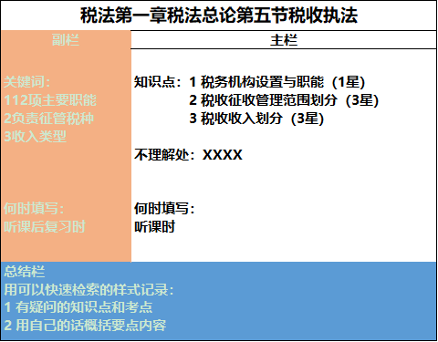 以《稅法》第一章稅法總論第五節(jié)稅收執(zhí)法為例。上網(wǎng)課時(shí),在主欄中根據(jù)老師總結(jié)的知識的重要程度,分星級記錄知識點(diǎn),如有不理解的地方也可記錄在主欄中;在課后根據(jù)主欄中的記錄、問題有針對性地進(jìn)行鞏固復(fù)習(xí),并提煉出適合自己的關(guān)鍵詞記錄在副欄中。在之后的復(fù)習(xí)中,可掩蓋主欄,根據(jù)副欄中的關(guān)鍵詞復(fù)述出知識點(diǎn)和問題答案,并在總結(jié)欄中用自己的話總結(jié)歸納要點(diǎn),以檢查知識的掌握程度,篩選出薄弱點(diǎn)。