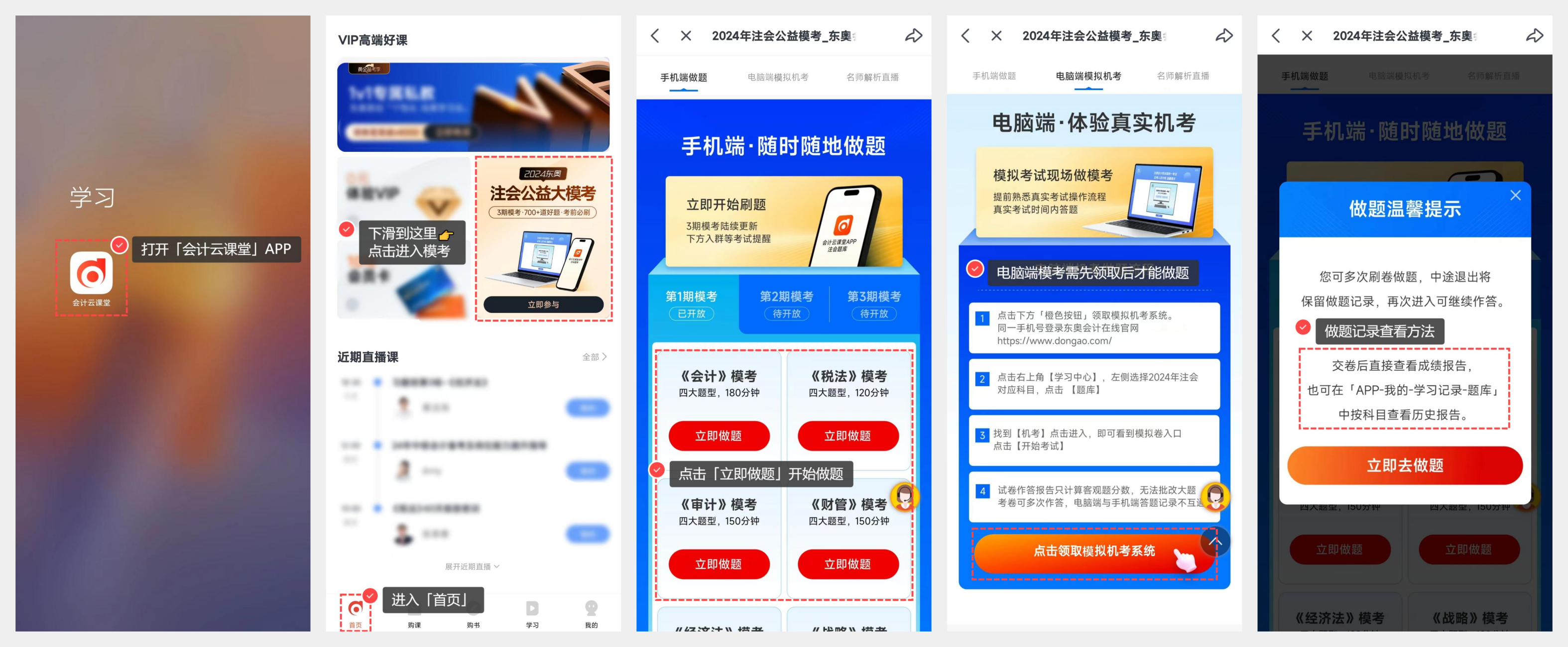 下載【會計云課堂】APP,進入【首頁】下滑屏幕找到【注會公益大??肌?,點擊【點擊領(lǐng)取模擬機考系統(tǒng)】按鈕,即可做題??忌啥啻嗡⒕碜鲱},中途退出后將保留做題記錄,再次進入繼續(xù)作答。點擊下圖查看步驟圖解!