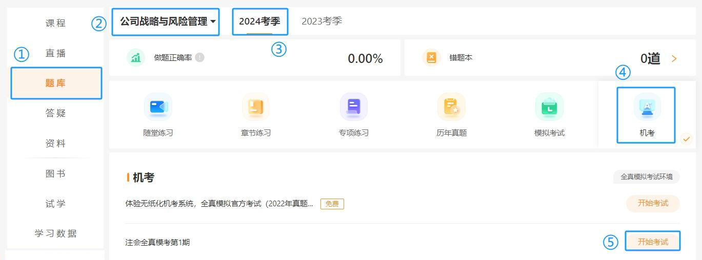 領(lǐng)卷后,考生可進入東奧【學(xué)習(xí)中心】完成機考。進入【學(xué)習(xí)中心】后在左側(cè)菜單選擇【題庫】,篩選考試【科目】和【考季】,找到【機考】點擊進入,而后點擊【開始考試】。點擊下圖查看步驟圖解!學(xué)習(xí)中心點擊進入>>