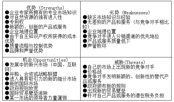 SWOT分析中最核心的部分是評(píng)價(jià)企業(yè)的優(yōu)勢和劣勢、判斷企業(yè)所面臨的機(jī)會(huì)和威脅并做出決策,即在企業(yè)現(xiàn)有的內(nèi)外部環(huán)境下,如何最優(yōu)地運(yùn)用自己的資源,并且考慮建立公司未來的資源.