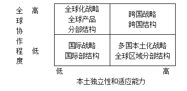 企業(yè)國(guó)際化經(jīng)營(yíng)的戰(zhàn)略基本上有4種類型,即國(guó)際戰(zhàn)略、多國(guó)本土化戰(zhàn)略、全球化戰(zhàn)略與跨國(guó)戰(zhàn)略,而這些戰(zhàn)略所依托的組織結(jié)構(gòu)如下圖所示。