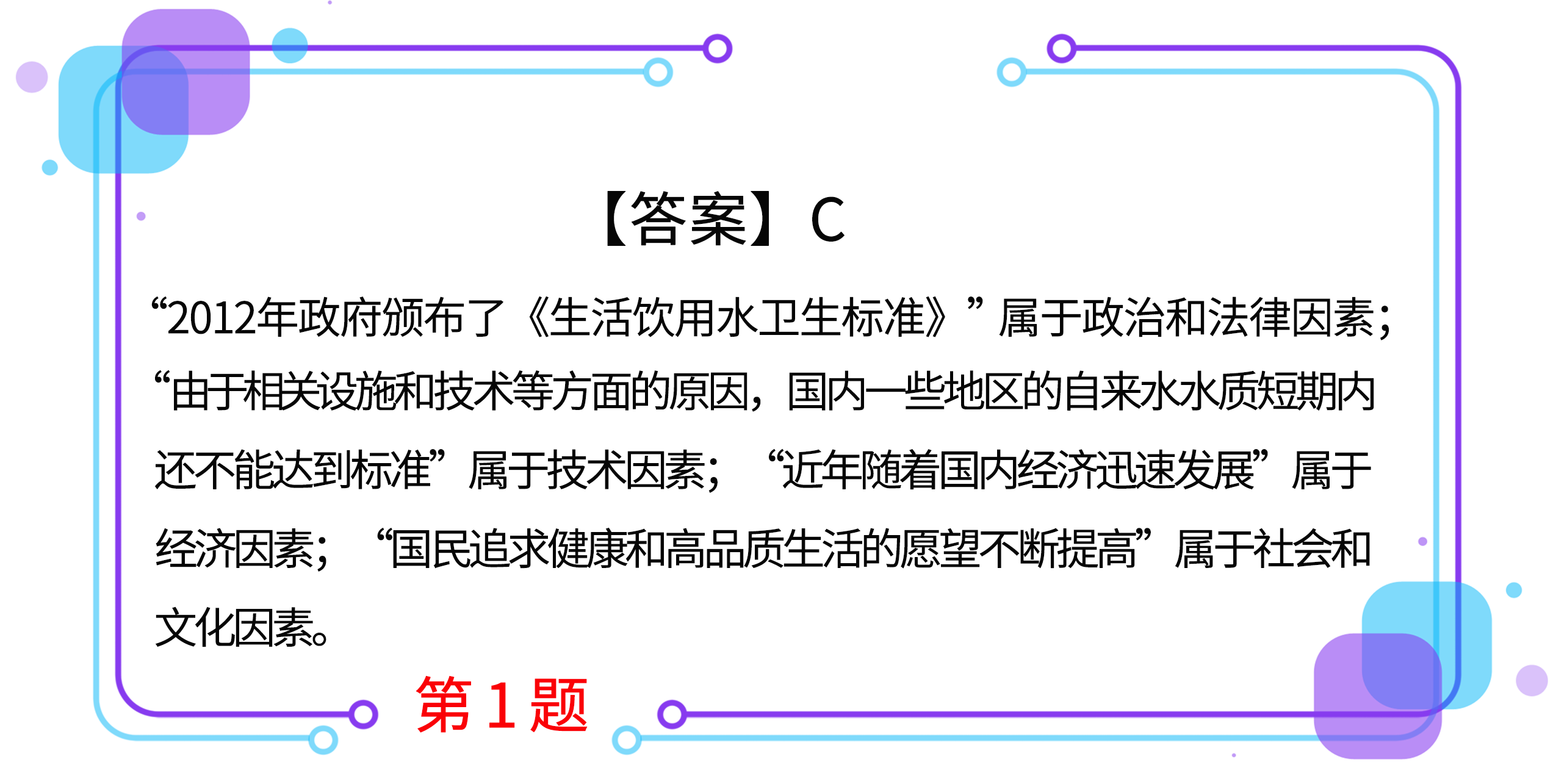 1.2012年政府頒布了《生活飲用水衛(wèi)生標(biāo)準(zhǔn)》。然而,由于相關(guān)設(shè)施和技術(shù)等方面的原因,國(guó)內(nèi)一些地區(qū)的自來(lái)水水質(zhì)短期內(nèi)還不能達(dá)到標(biāo)準(zhǔn)。同時(shí),近年隨著國(guó)內(nèi)經(jīng)濟(jì)迅速發(fā)展,國(guó)民追求健康和高品質(zhì)生活的愿望不斷提高。通過(guò)對(duì)上述情況的分析,華道公司于2013年從國(guó)外引進(jìn)自來(lái)水濾水壺項(xiàng)目,獲得成功。本案例中,華道公司外部環(huán)境分析所采用的主要方法是( )。(2019年)