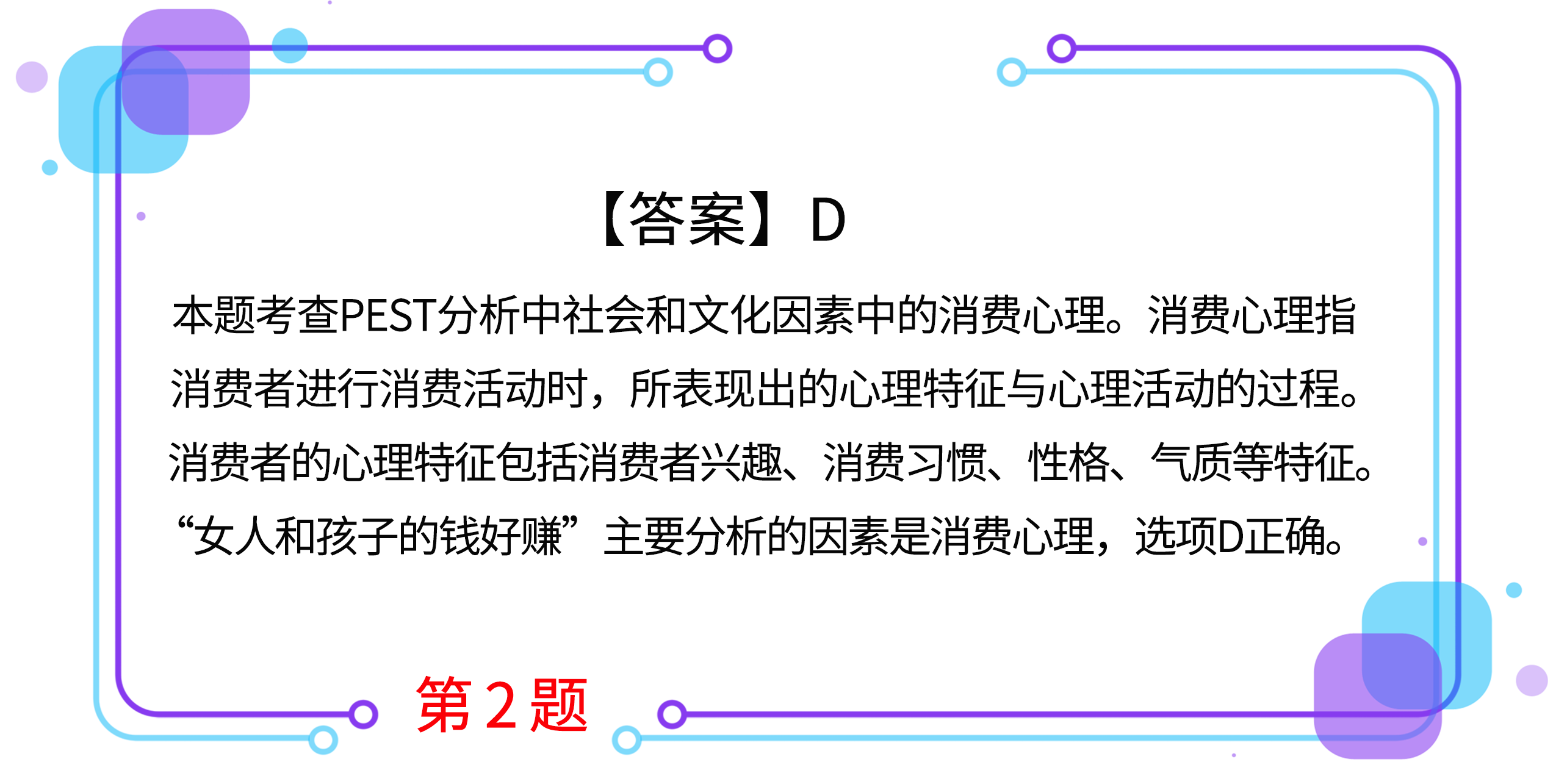 2.商界有句名言“女人和孩子的錢(qián)好賺”。從戰(zhàn)略分析角度來(lái)看,該說(shuō)法主要分析的因素是( )。