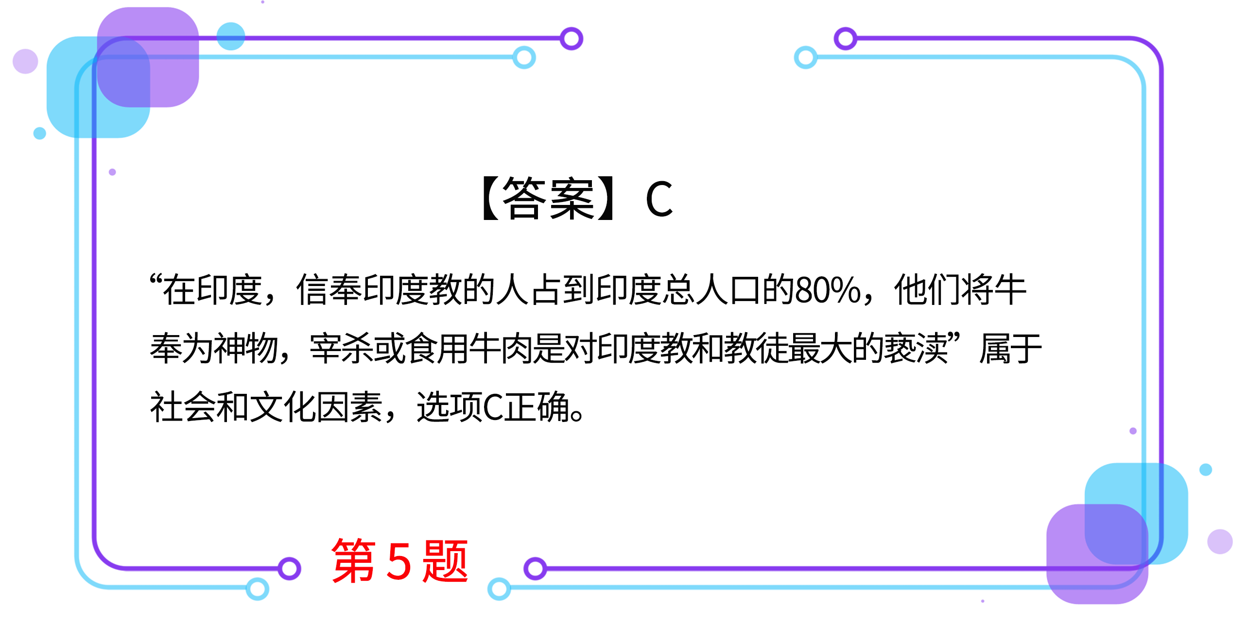 5.在10多年前,因被報(bào)道在全球分店使用含有牛肉調(diào)味劑的油脂制作法式炸薯?xiàng)l,麥當(dāng)勞幾乎被迫撤離印度市場(chǎng)。眾所周知,麥當(dāng)勞是以漢堡作為其主打產(chǎn)品的,然而漢堡的主要原料牛肉卻成為麥當(dāng)勞在印度惹爭(zhēng)議的一個(gè)根源。在印度,信奉印度教的人占到印度總?cè)丝诘?0%,他們將牛奉為神物,宰殺或食用牛肉是對(duì)印度教和教徒最大的褻瀆。麥當(dāng)勞宣布于2013年在印度開(kāi)全素麥當(dāng)勞餐廳,這表明麥當(dāng)勞不愿放棄印度市場(chǎng),為吸引消費(fèi)者不斷做出改進(jìn)。以上信息表明麥當(dāng)勞在進(jìn)行戰(zhàn)略規(guī)劃時(shí)考慮了( )。