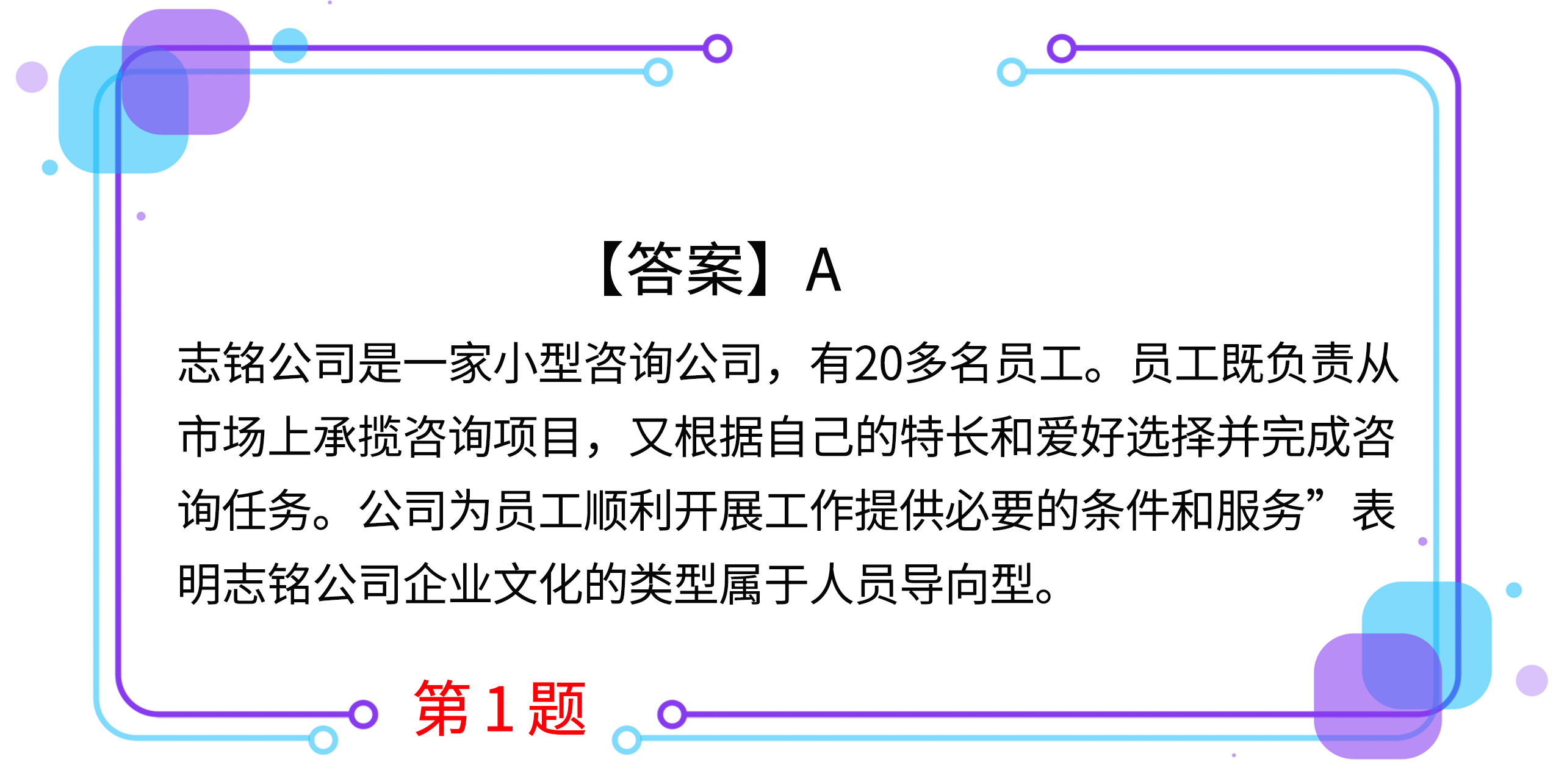 1.志銘公司是一家小型咨詢公司,有20多名員工,員工既負責從市場上承攬咨詢項目,又根據(jù)自己的特長和愛好選擇并完成咨詢?nèi)蝿?wù)。公司為員工順利開展工作提供必要的條件和服務(wù)。志銘公司企業(yè)文化的類型屬于( )。(2018年)