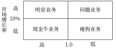 橫軸:相對市場占有率=企業(yè)某項業(yè)務(wù)的市場份額/這個市場上最大競爭對手的市場份額,通常用1.0作為相對市場占有率高(大于1.0)、低(小于1.0)的界限。相對市場占有率是決定企業(yè)業(yè)務(wù)結(jié)構(gòu)是否合理的內(nèi)在因素。