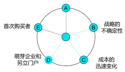 戰(zhàn)略的不確定性:產(chǎn)業(yè)內(nèi)的企業(yè)對于競爭對手、顧客特點(diǎn)和處于新興階段的產(chǎn)業(yè)條件等只有較少的信息,沒有企業(yè)知道所有的競爭者是誰,也沒有企業(yè)能夠經(jīng)常得到可靠的產(chǎn)業(yè)銷售量和市場份額的信息。所以,企業(yè)在產(chǎn)品—市場定位、市場營銷和服務(wù)等方面經(jīng)常會進(jìn)行多種嘗試,沒有“正確”的戰(zhàn)略被公認(rèn)。