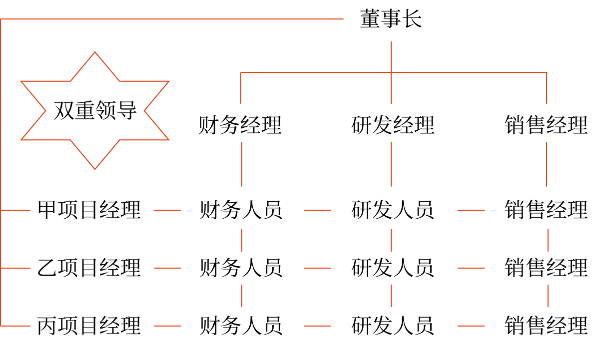 含義:既包含職能專業(yè)化又包含產(chǎn)品或項目專業(yè)化的二元組織結(jié)構(gòu)。矩陣制組織結(jié)構(gòu)是為了改進職能制組織結(jié)構(gòu)橫向聯(lián)系差、缺乏彈性的缺點而形成的一種組織結(jié)構(gòu)形式。該結(jié)構(gòu)由縱、橫兩套管理系統(tǒng)疊加在一起組成一個矩陣,其中縱向系統(tǒng)一般是按照職能劃分的指揮系統(tǒng),橫向系統(tǒng)一般是按產(chǎn)品、項目或服務(wù)組成的管理系統(tǒng)。