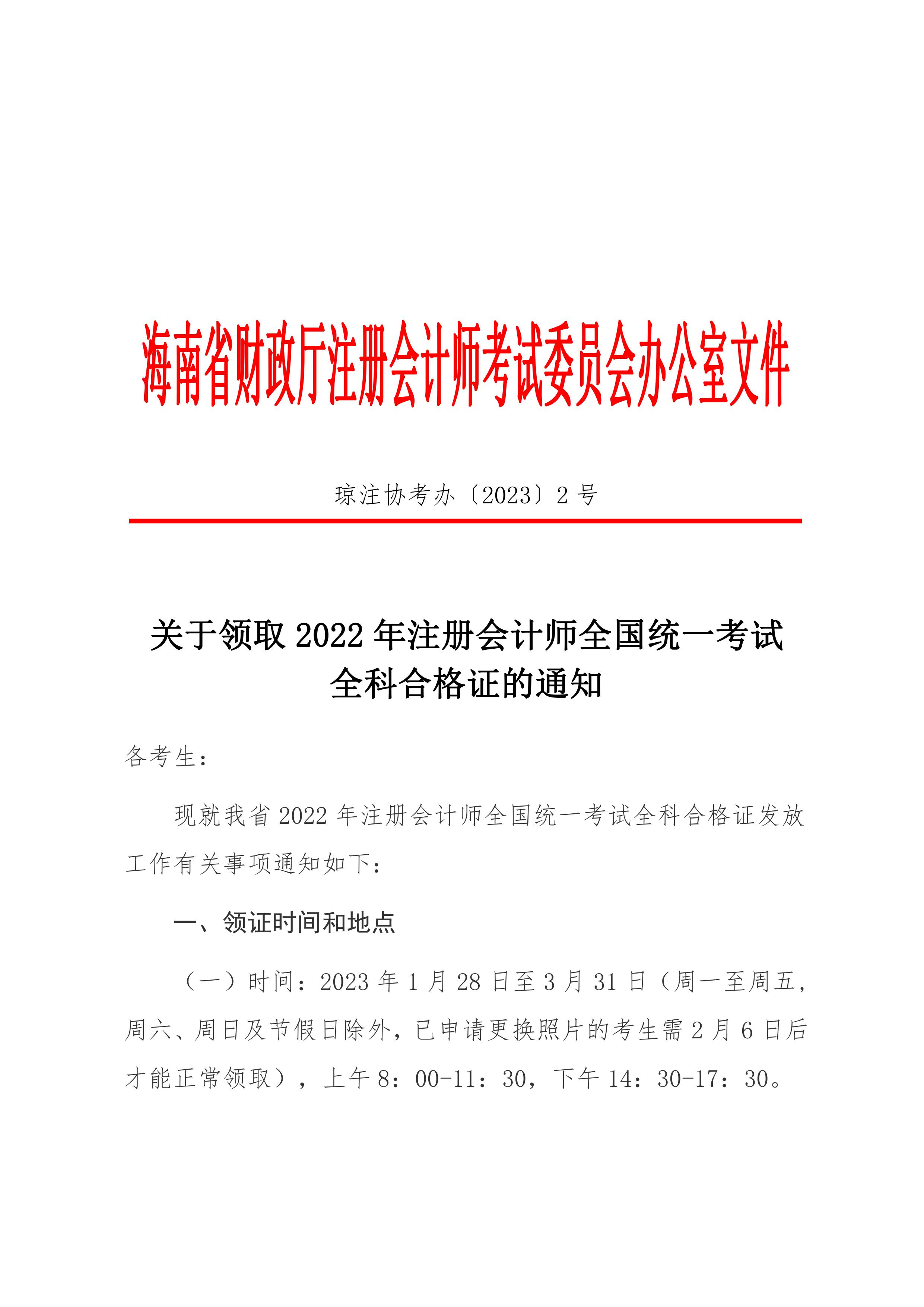 海南發(fā)布關于領取2022年注冊會計師全國統(tǒng)一考試全科合格證的通知