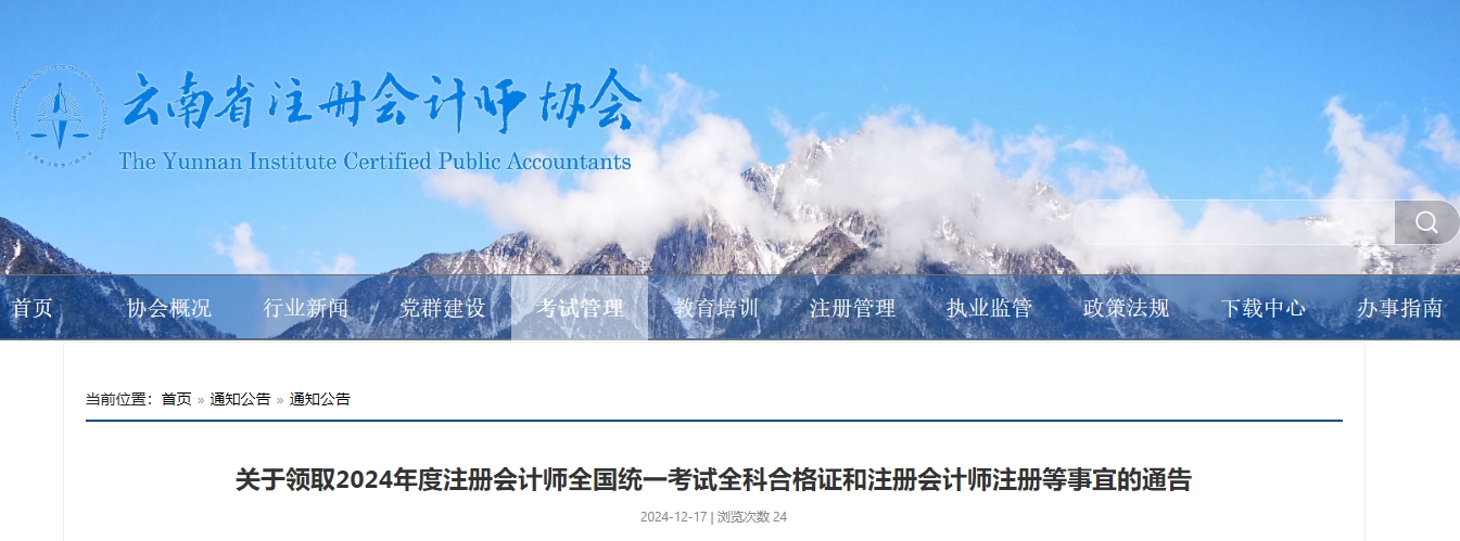 云南省注協(xié)發(fā)布關(guān)于領(lǐng)取2024年度注冊會計師考試全科合格證的通告