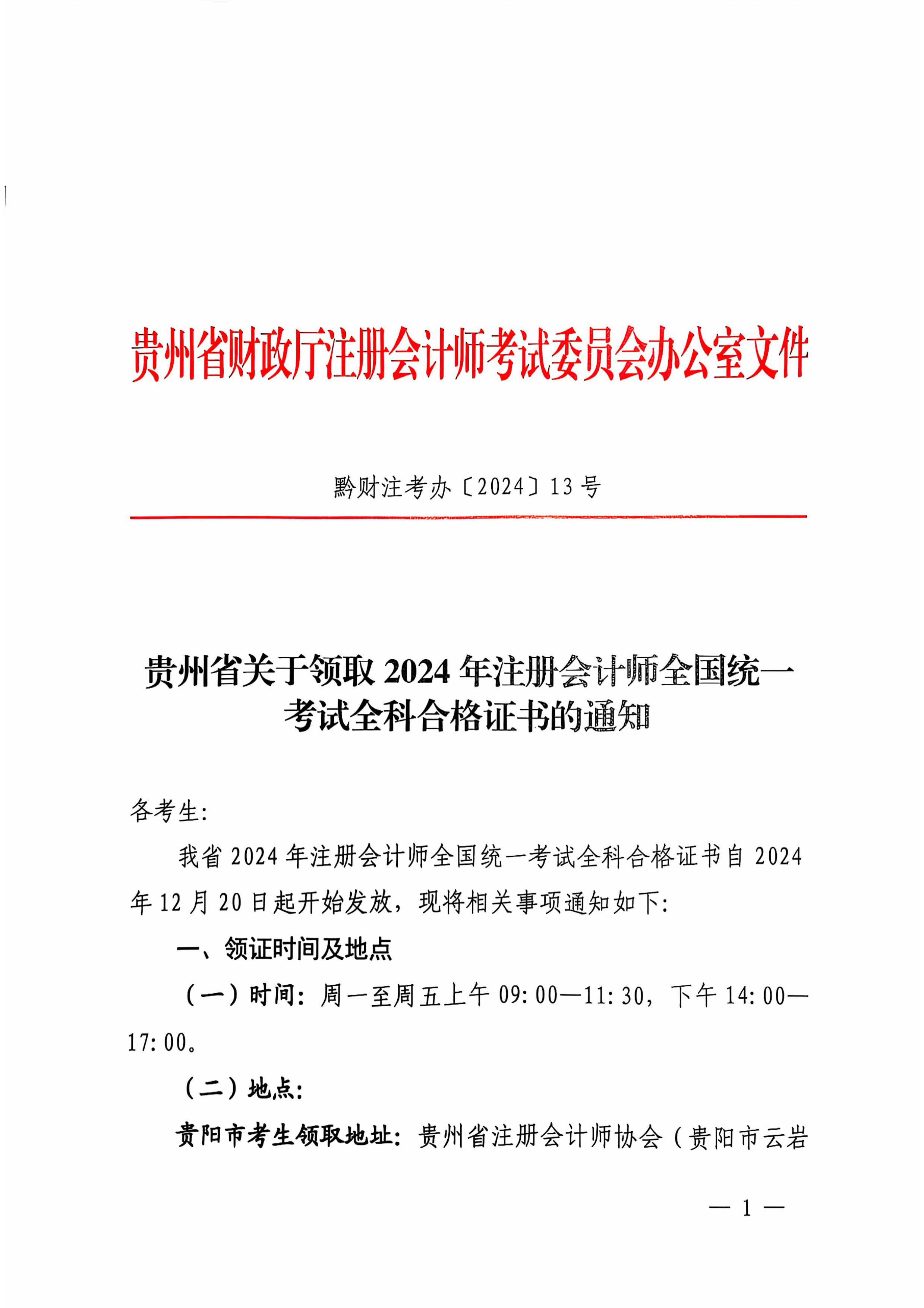 貴州省關(guān)于領(lǐng)取2024年注冊會計(jì)師全國統(tǒng)一考試全科合格證書的通知