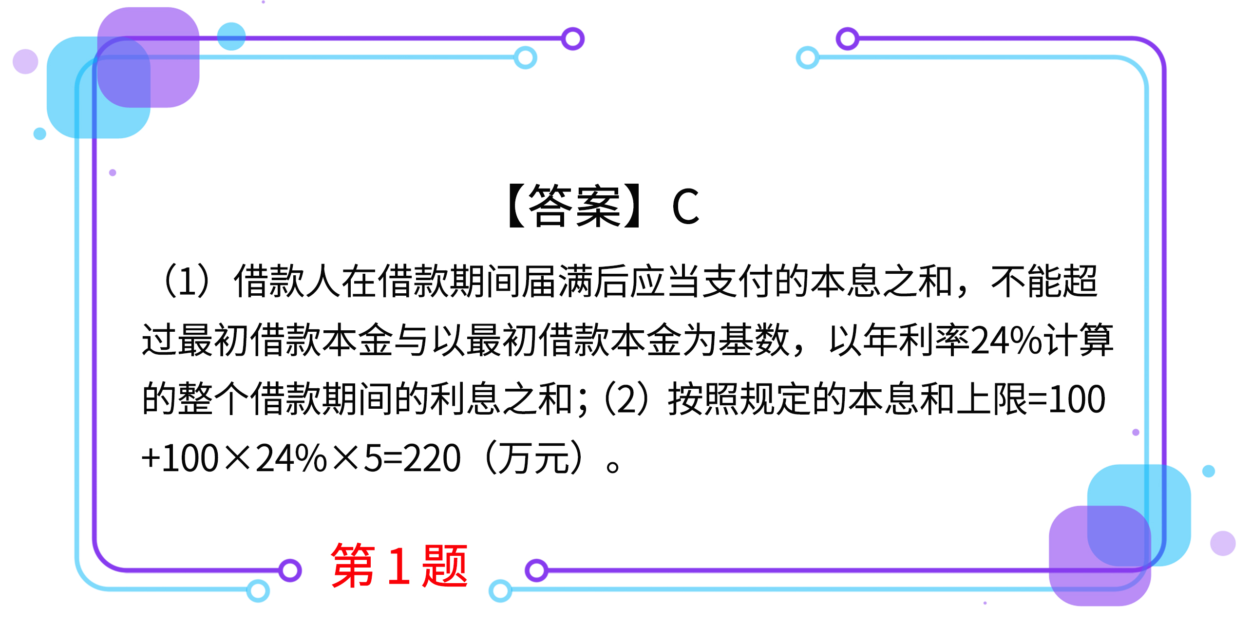 1.甲公司向乙公司借款100萬元,約定借款期限為5年,每年為1期并復(fù)利計(jì)息,年利率各期均為20%,每期屆滿后重新出具債權(quán)憑證確認(rèn)上期利息并明確下期本金。根據(jù)合同法律制度的規(guī)定,出借人乙公司在借款期間屆滿后有權(quán)請(qǐng)求甲公司支付的本息和上限為( )萬元。