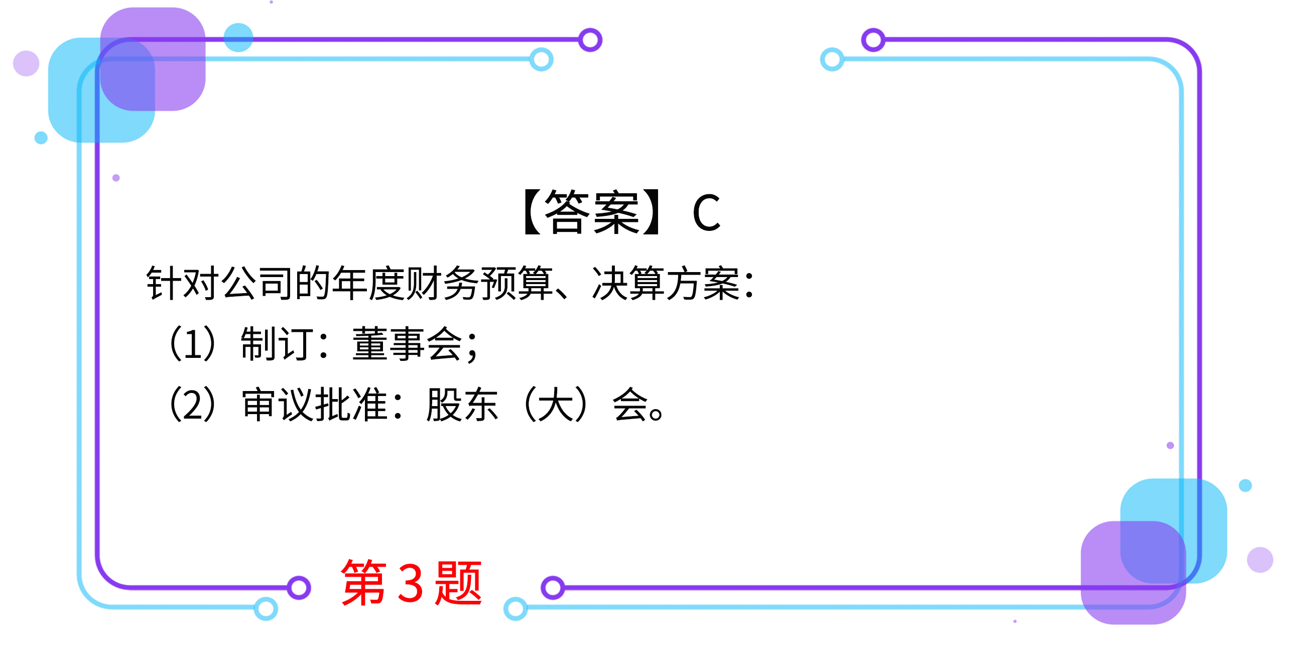 3.根據(jù)公司法律制度的規(guī)定,下列各項中,有權(quán)制訂公司年度財務(wù)預(yù)算、決算方案的是( )。(2019年)