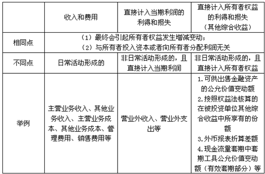 “收入和費(fèi)用”、“直接計入當(dāng)期利潤的利得和損失”和“直接計入所有者權(quán)益的利得和損失”的比較: