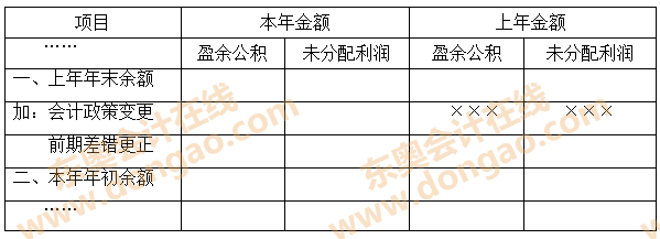 其中,會(huì)計(jì)政策變更累積影響數(shù),是指按照變更后的會(huì)計(jì)政策對(duì)以前各期追溯計(jì)算的列報(bào)前期最早期初留存收益應(yīng)有金額與現(xiàn)有金額之間的差額。即變更年度所有者權(quán)益變動(dòng)表中“上年金額”欄目“盈余公積”和“未分配利潤(rùn)”項(xiàng)目的調(diào)整,如下表所示: