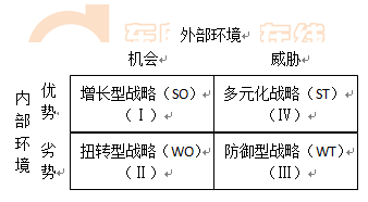1.優(yōu)勢——機(jī)會(SO)。增長型戰(zhàn)略是一種發(fā)展企業(yè)內(nèi)部優(yōu)勢與利用外部機(jī)會的戰(zhàn)略,是一種理想的戰(zhàn)略模式。當(dāng)企業(yè)具有特定方面的優(yōu)勢,而外部環(huán)境又為發(fā)揮這種優(yōu)勢提供有利機(jī)會時(shí),可以采取該戰(zhàn)略。例如良好的產(chǎn)品市場前景、供應(yīng)商規(guī)模擴(kuò)大和競爭對手有財(cái)務(wù)危機(jī)等外部條件,配合企業(yè)市場份額提高等內(nèi)在優(yōu)勢可成為企業(yè)收購競爭對手、擴(kuò)大生產(chǎn)規(guī)模的有利條件。