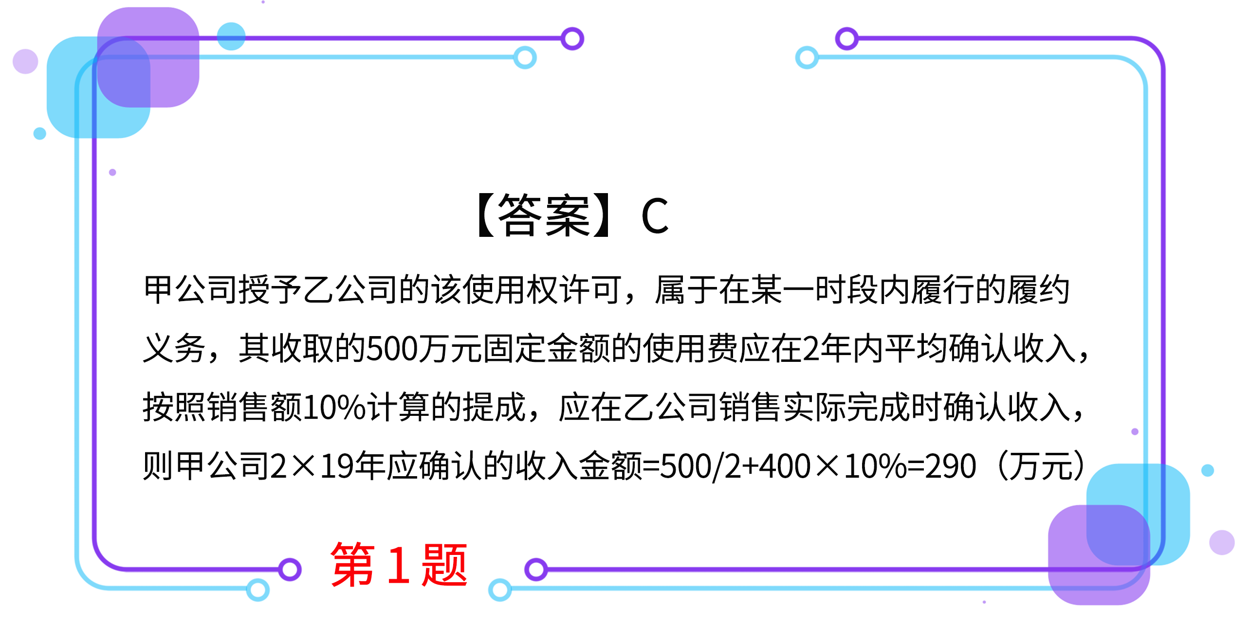 1.甲公司為一家籃球俱樂部,2×19年1月與乙公司簽訂合同,約定乙公司有權(quán)在未來兩年內(nèi)在其生產(chǎn)的水杯上使用甲公司球隊的圖標,甲公司收取固定使用費500萬元,以及按照乙公司當年銷售額的10%計算提成。乙公司預期甲公司會繼續(xù)參加當?shù)芈?lián)賽,并取得優(yōu)異成績。乙公司在2×19年實現(xiàn)銷售收入400萬元。假定不考慮其他因素,甲公司2×19年應確認收入的金額為( )萬元。