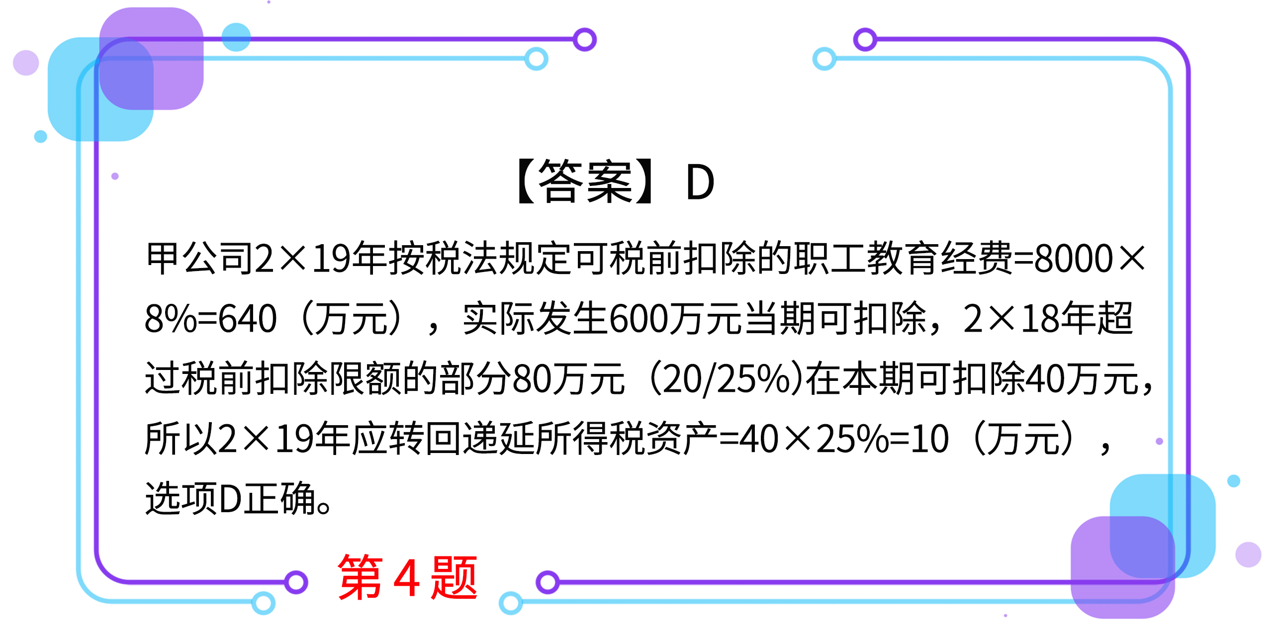 4.甲公司適用的所得稅稅率為25%。2×18年12月31日因職工教育經(jīng)費(fèi)超過稅前扣除限額確認(rèn)遞延所得稅資產(chǎn)20萬元;2×19年度,甲公司實(shí)際發(fā)生工資薪金支出為8000萬元,本期全部發(fā)放,發(fā)生職工教育經(jīng)費(fèi)600萬元。稅法規(guī)定,工資薪金按實(shí)際發(fā)放金額在稅前列支,企業(yè)發(fā)生的職工教育經(jīng)費(fèi)支出,不超過工資薪金總額8%的部分,準(zhǔn)予扣除;超過部分準(zhǔn)予在以后納稅年度結(jié)轉(zhuǎn)扣除。甲公司2×19年12月31日下列會計處理中正確的是(  )。