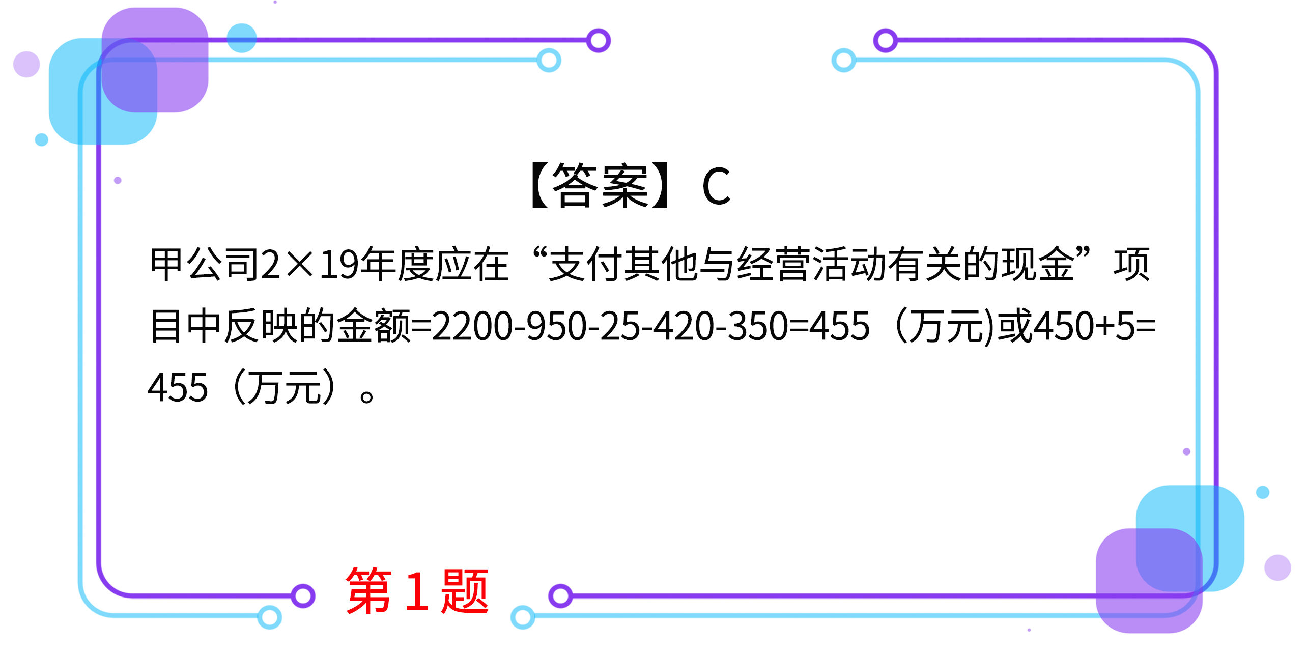 1.甲公司2×19年度發(fā)生的管理費用為2200萬元,其中:以現(xiàn)金支付退休職工統(tǒng)籌退休金450萬元和管理人員工資950萬元,存貨盤虧損失25萬元,計提固定資產(chǎn)折舊420萬元,計提無形資產(chǎn)攤銷350萬元,以現(xiàn)金支付保險費5萬元。甲公司2×19年度應(yīng)在“支付其他與經(jīng)營活動有關(guān)的現(xiàn)金”項目中反映的金額為( )萬元。