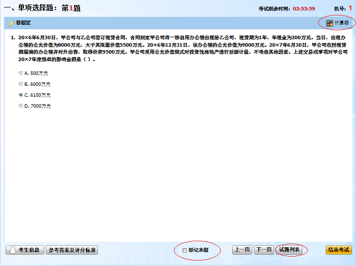 如果在做題過(guò)程中遇到難題,暫時(shí)得不出答案,可以使用“標(biāo)記本題”按鈕做標(biāo)記,等所有題目做完時(shí),通過(guò)“試題列表”按鈕,我們可以查看哪些題做了標(biāo)記,需要重新做,這兩個(gè)按鈕替代了以為筆試時(shí)考生在試卷上做標(biāo)記,并且更方便我們查找標(biāo)記題,也避免在做題過(guò)程中有漏題的現(xiàn)象發(fā)生。