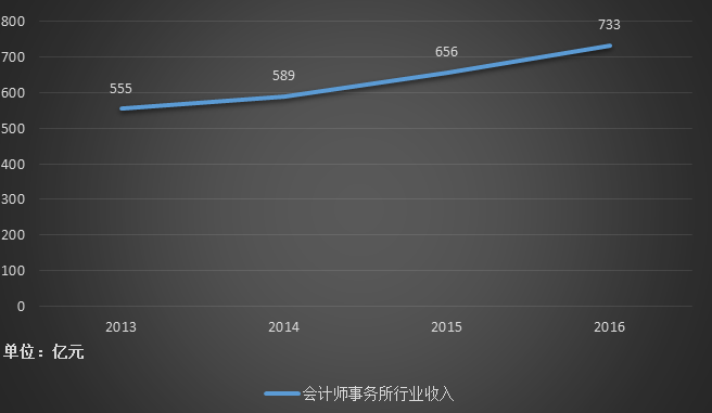 在經(jīng)歷資本市場(chǎng)的磨礪和洗禮,注冊(cè)會(huì)計(jì)師行業(yè)從2013年的555億元增長(zhǎng)到2016年的733億,增率為9.7%,超過(guò)同期國(guó)內(nèi)生產(chǎn)總值增速。預(yù)計(jì)2017年全行業(yè)收入達(dá)到900億元。