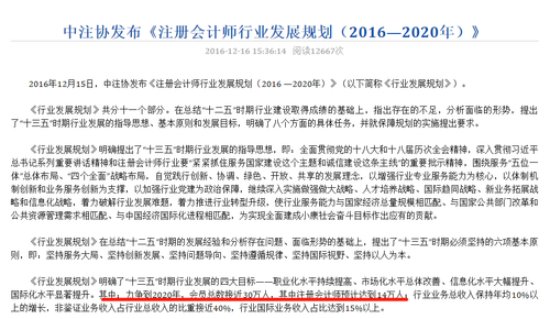 對于《注冊會計師行業(yè)發(fā)展規(guī)劃》相信很多考生早就有所耳聞,它明確了“十三五”時期行業(yè)發(fā)展的四大目標(biāo)之一,就是職業(yè)化水平持續(xù)提高。其中,力爭到2020年會員總數(shù)接近30萬人,其中注冊會計師預(yù)計達(dá)到14萬人。