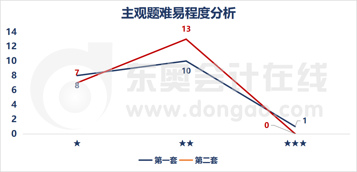 從上面的數(shù)據(jù)來看,主觀題考點主要集中在2星難度。根據(jù)考生反饋,財管考試計算量大,部分考點較偏,無論是考題的難度,還是廣度均呈上升趨勢。建議考生應(yīng)當(dāng)擴(kuò)大復(fù)習(xí)面,并且提高答題速度。