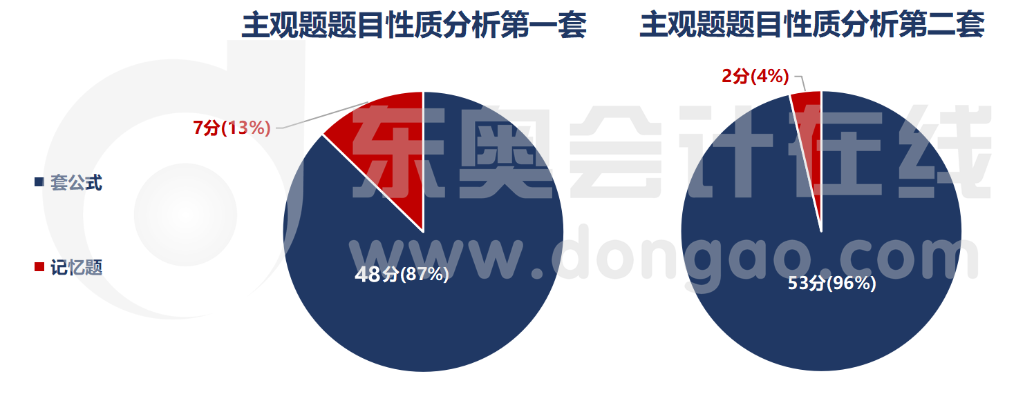 注會財管主觀題考查類型主要有記憶題、套公式題。第一套試題中套公式題占主觀題的87%,分值是48分;第二套試題中套公式題占主觀題的96%,分值是53分。
