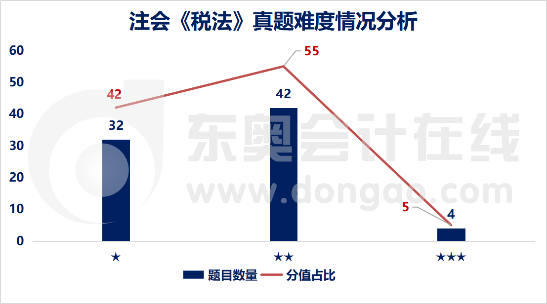 稅法考試中,2星難度考點題量最多,分值也最高;1星難度考點次之,3星難度考點最少。1星難度考點共計32道題,分值為41分;2星難度考點共計42道題,分值為53分;3星難度考點共計4道題,分值為7分。