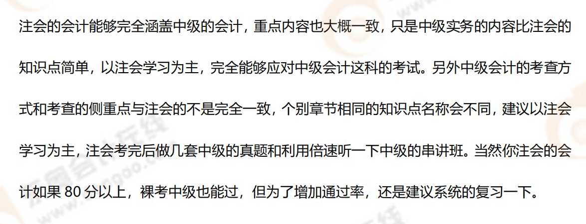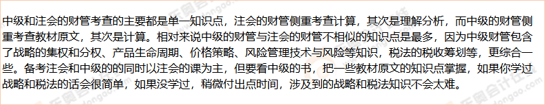 注冊(cè)會(huì)計(jì)師《會(huì)計(jì)》、《財(cái)管》和《經(jīng)濟(jì)法》基本包含了中級(jí)會(huì)計(jì)《中級(jí)會(huì)計(jì)實(shí)務(wù)》、《財(cái)務(wù)管理》和《經(jīng)濟(jì)法》考試的內(nèi)容。