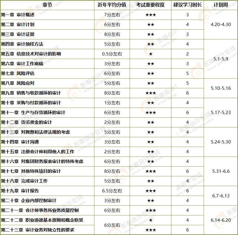 注會(huì)審計(jì)共有23章,其中一星考點(diǎn)2章、二星考點(diǎn)14章、3星考點(diǎn)7章。為了幫助考生們提高報(bào)考效率,東奧小編也為大家標(biāo)注了各章節(jié)近幾年的出題分值及每章節(jié)的學(xué)習(xí)時(shí)長(zhǎng)。畢竟今年的注會(huì)考試提前至8月舉行,備考時(shí)間對(duì)于大家來(lái)說(shuō)非常珍貴,所以盡量把時(shí)間花在重點(diǎn)章節(jié)上。東奧小編也根據(jù)劉圣妮老師的基礎(chǔ)班課程整理了各科目的重要知識(shí)點(diǎn),千萬(wàn)別錯(cuò)過(guò)哦!