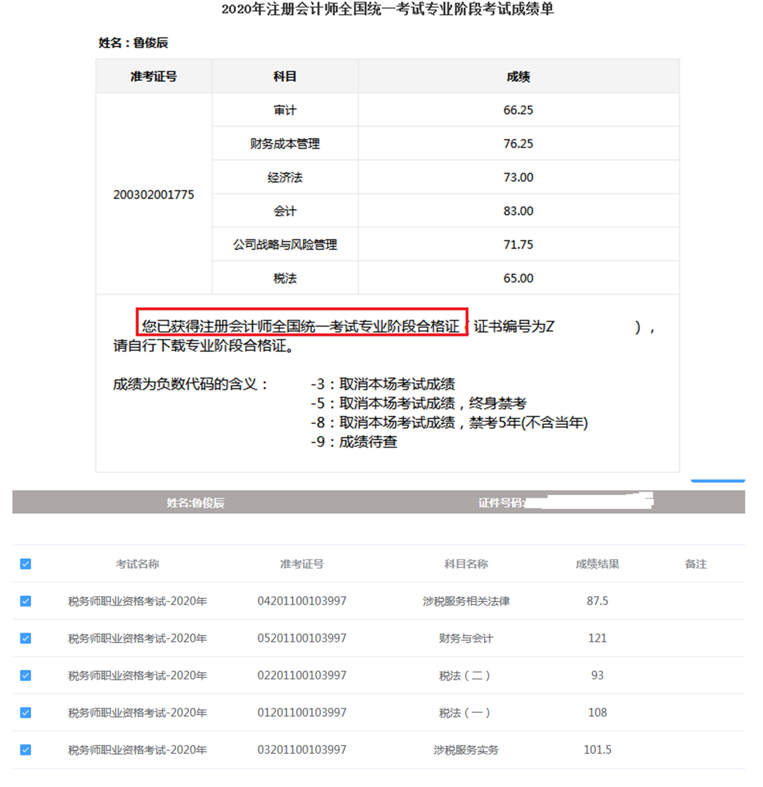 學(xué)員魯俊辰的注冊會(huì)計(jì)師稅務(wù)師一備兩考成績單