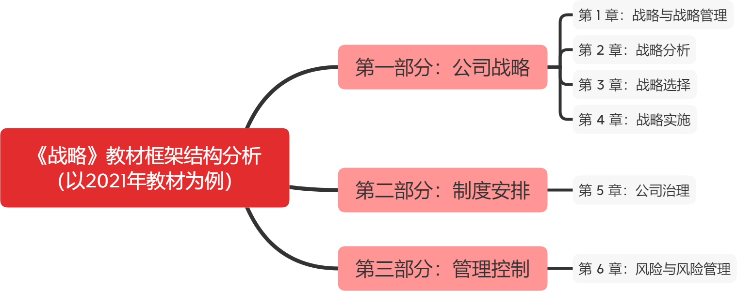 2022年注會(huì)戰(zhàn)略官方教材尚未發(fā)布,以 2021年注會(huì)戰(zhàn)略教材為例,教材主要分為三部分,共計(jì)6章。以下是教材框架結(jié)構(gòu)分析,考生需著重關(guān)注第二章(戰(zhàn)略分析)、第三章(戰(zhàn)略選擇)、第六章(風(fēng)險(xiǎn)與風(fēng)險(xiǎn)管理)的學(xué)習(xí)。