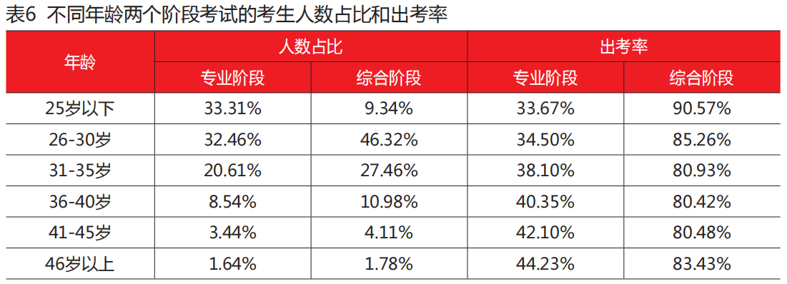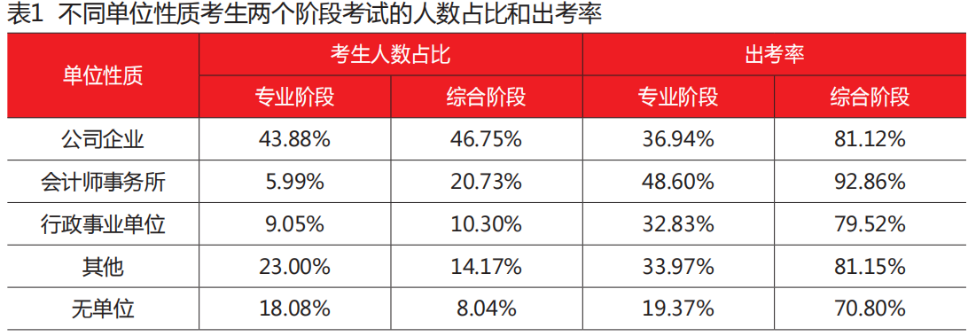 除此之外無單位考生的專業(yè)階段報(bào)名人數(shù)占比幾近20%,而專業(yè)階段考試報(bào)名人數(shù)占比卻不足10%,兩個(gè)階段考試的出考率也并不高,對(duì)于無單位考生而言,注冊(cè)會(huì)計(jì)師證書是尋求就業(yè)的機(jī)會(huì)之一。