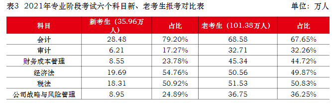 中注協(xié)發(fā)布了《2021年注冊(cè)會(huì)計(jì)師全國(guó)統(tǒng)一考試分析報(bào)告》,其中包含了新、老考生的報(bào)考對(duì)比。